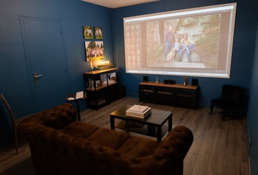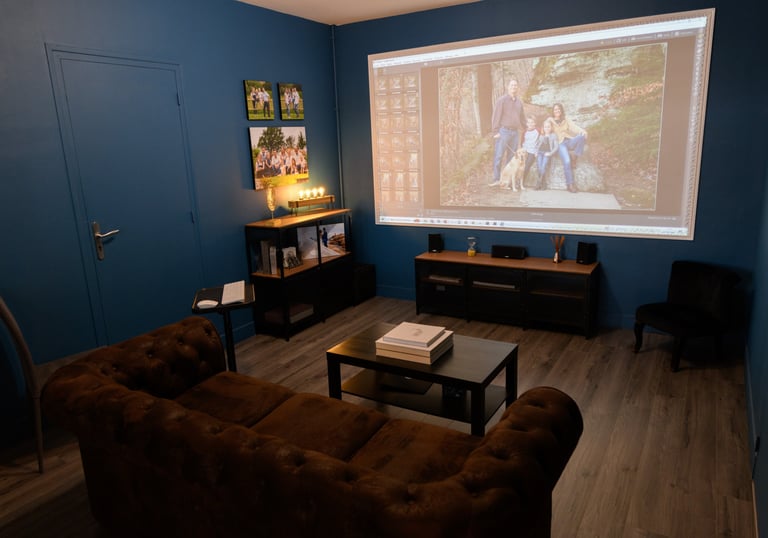 Chaleureux et cocooning, le salon de projection vous permet de découvrir sur grand écran les photos réalisées lors de votre séance.
